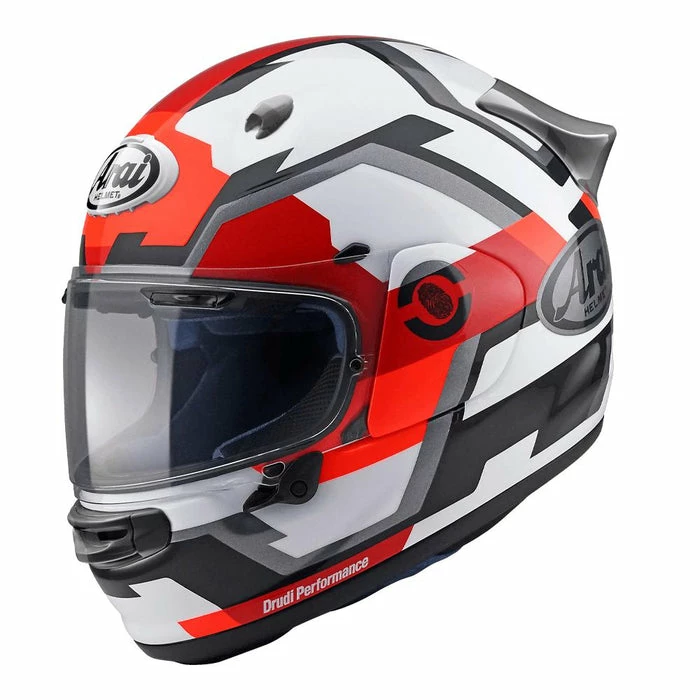 Built with protection in mind the Arai Quantic Face helmet in Red, is a premium sports touring helmet. Manufactured by hand, the Quantic is one of Arai’s more comfortable, quietest, and safest helmets. In a standout red graphic design, this motorcycle helmet is the perfect choice for any rider wanting to add a bit of fire to their look.