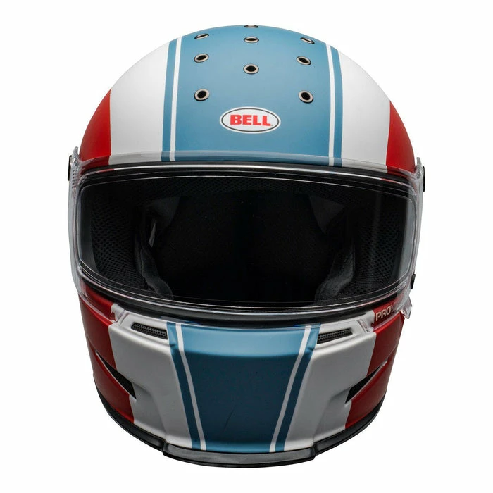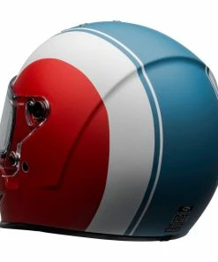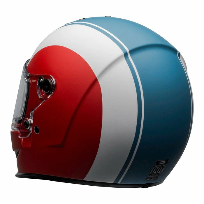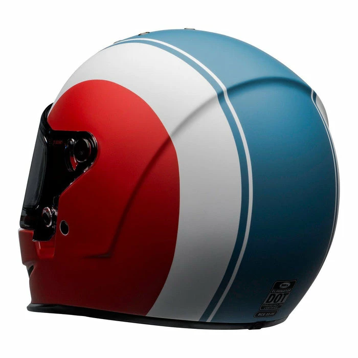 The Bell Eliminator Carbon full-face Slayer helmet in White/Red/Blue is built for the streets but inspired by automotive. A fierce looking motorcycle helmet that has been completely stripped down to deliver the perfect fit, protection and style. The Eliminator is made from a 6K carbon shell that is incredibly lightweight, but offers all the necessary protection you would expect from Bell. Included is Bell’s new ProVision visor which offers a dual-pane antifog design that prevents the visor from fogging up. Wear with either a peak or a visor, both of which look completely awesome, the shell design is bold and delivers assertive street performance. One of the key features of the Eliminator is ventilation. Offering nine riveted vents on the forehead, which provide amazing airflow for when you riding in the summer, there is also an optional vent plug for the cooler months and this has the added benefit of keeping out the rain!