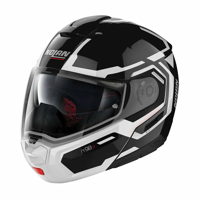 This is Nolan’s new entry-level flip up helmet. It is characterised by a solid and compact design and its generous technical specifications. Double P/J homologation, ultrawide visor, VPS sunscreen (adjustable in various positions), AirBooster Technology upper ventilation system, exclusive double action chin guard opening mechanism, double lever Microlock2 retention system with micrometric adjustment and set-up for the N-Com communication system make the N90-3 an interesting flip up helmet for both the scooter and motorbike sectors.
